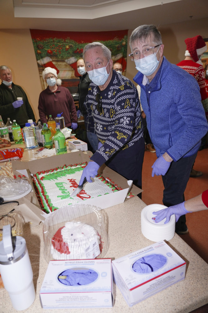 DG Marcel with Randy Letto, President to the HVGB Rotary club cut the cake for residents of the Long Term Care facility.