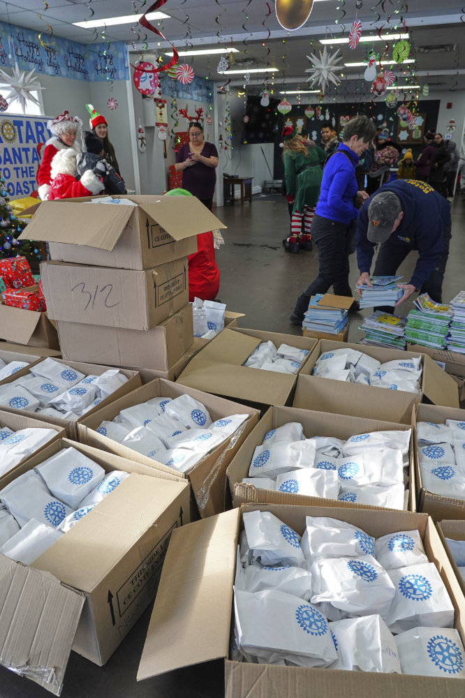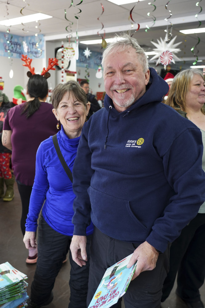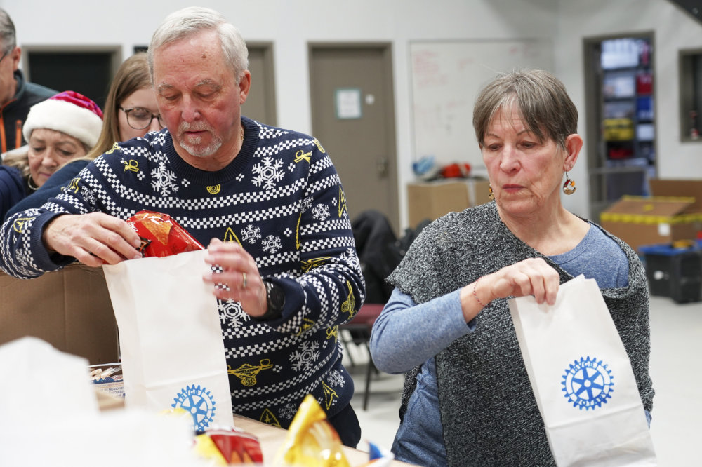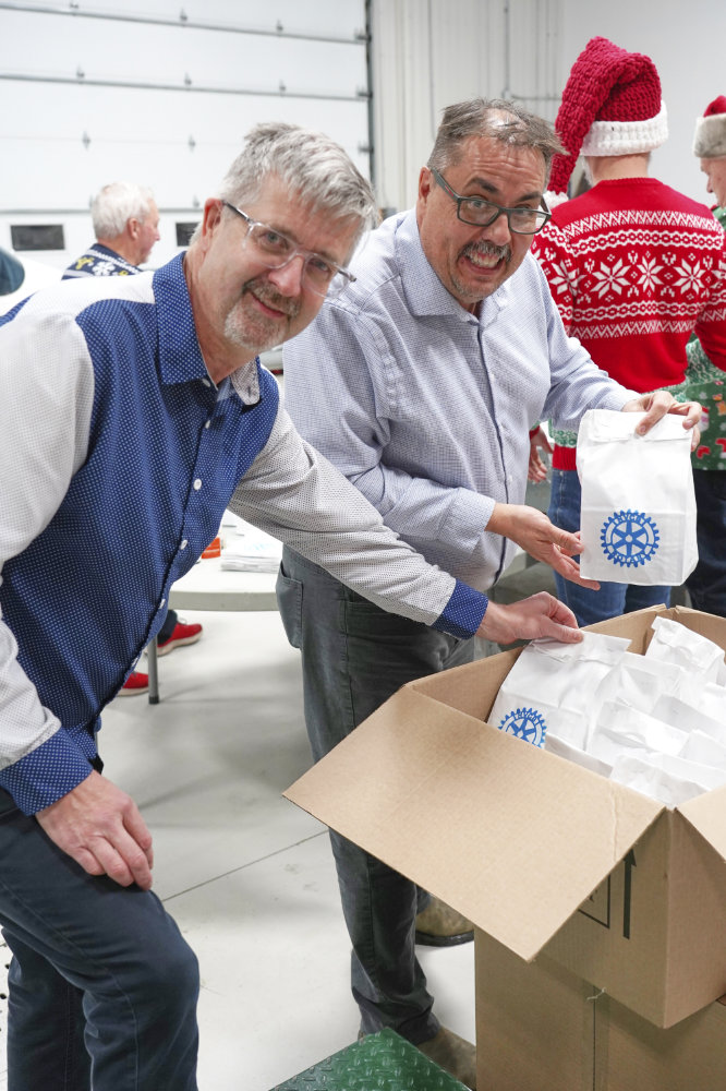 HVGB Rotary Club president Randy Letto with Wyman Jacque of Torngait Services pack gifts for the upcoming Santa To The Coast trip.