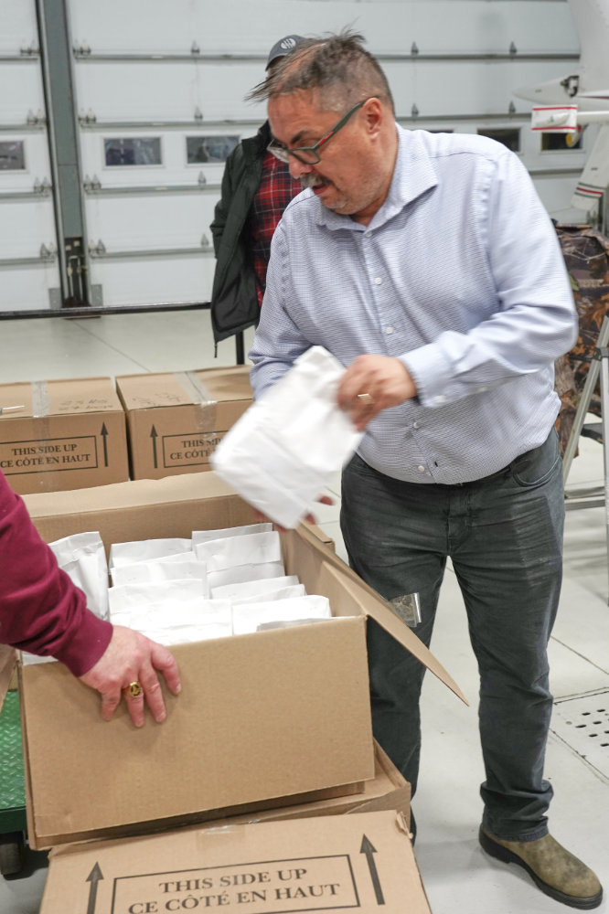 DG Marcel packing gifts at the Tiger Inc. hanger in preparation for the Santa To The Coast trip to northern Labrador.