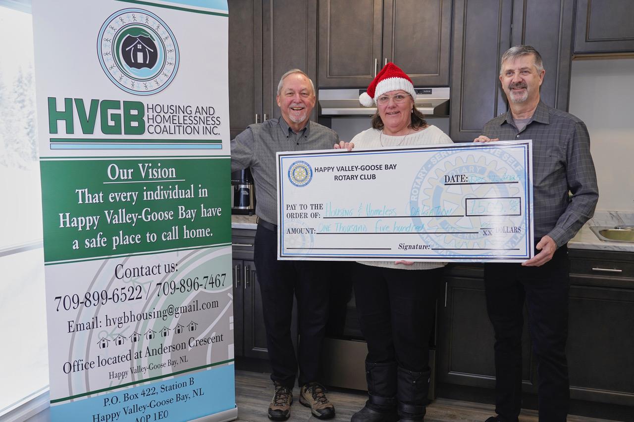 While in Happy Valley-Goose Bay DG Marcel and club president Randy Letto present a cheque to Jackie Compton-Hobbs of the Housing & Homeless Alliance.