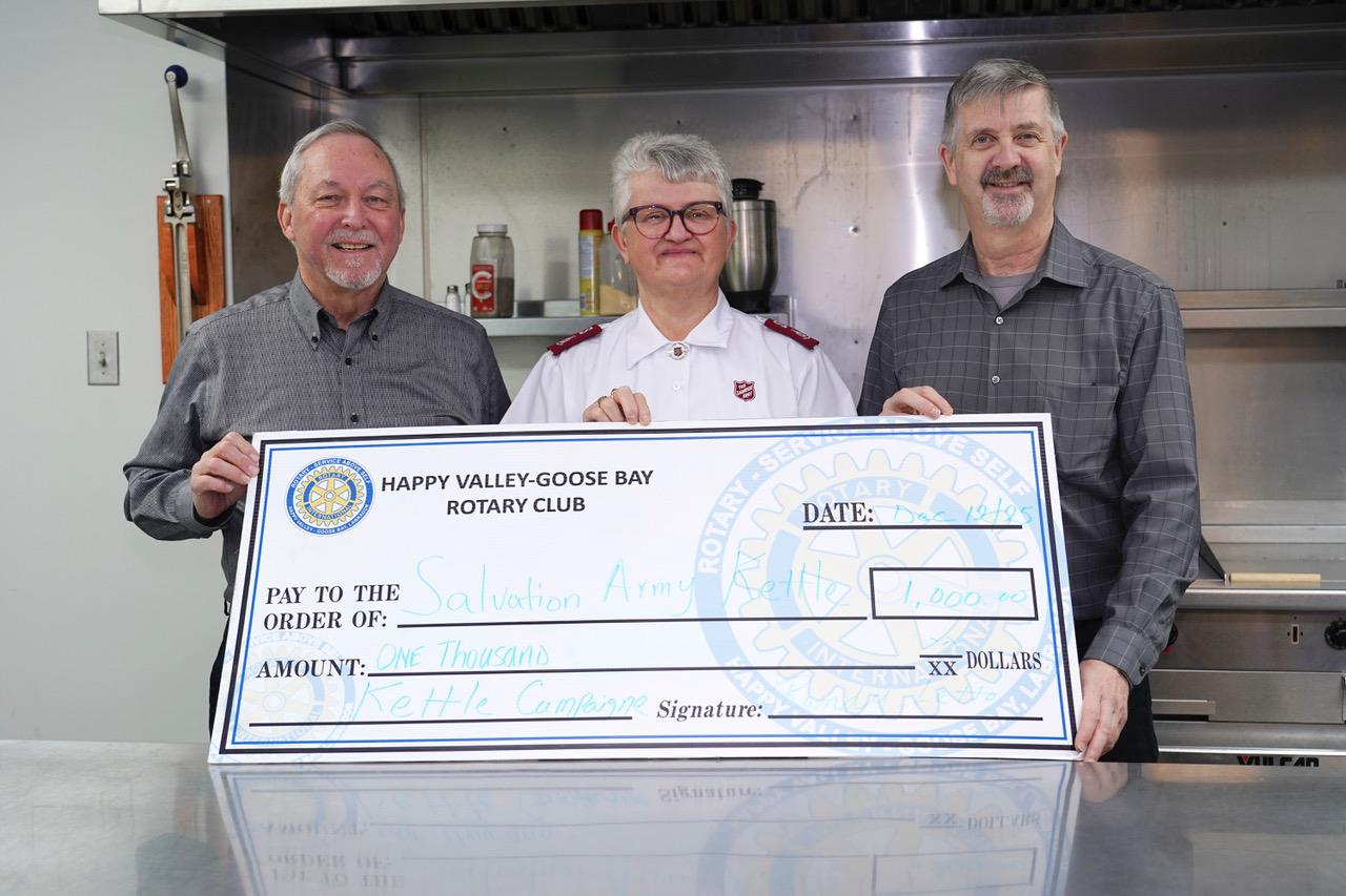 While in Happy Valley-Goose Bay DG Marcel and club president Randy Letto present a cheque to Major Kay Barnes for the Salvation Army Christmas Kettle Campaign.