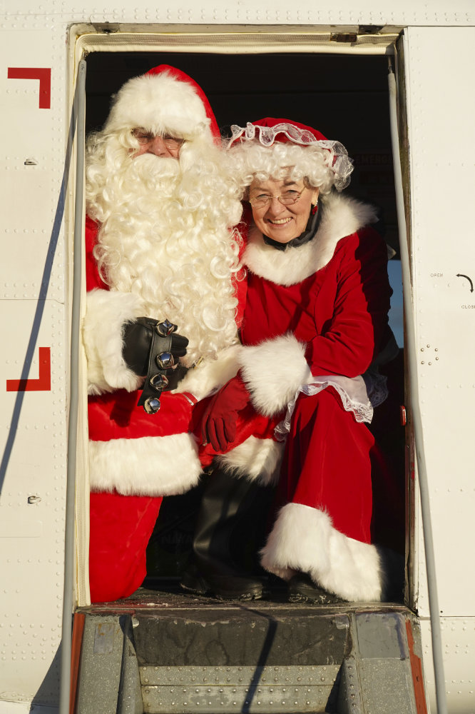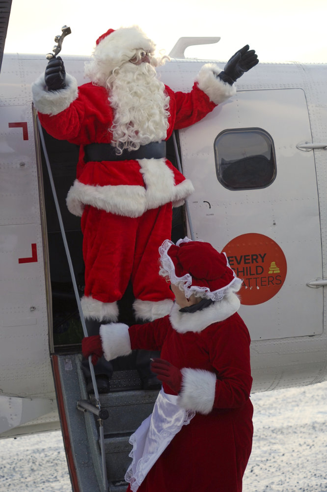 Mr & Mrs Clause (Rodney & Delphine Roberts) in the doorway of the Air Borealis Twin Otter.