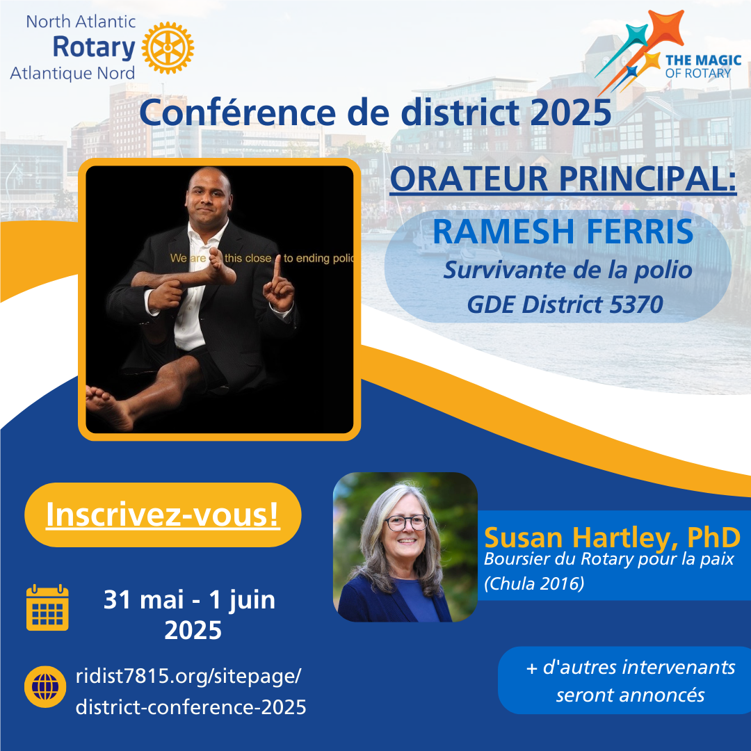Rejoignez-nous à Halifax, en Nouvelle-Écosse, du 30 mai au 1er juin 2025, pour un week-end magique rempli de camaraderie, d'innovation et d'idées sur la façon d'avoir un plus grand impact dans notre communauté et au-delà. Nous sommes ravis d'annoncer l'intervention de Ramesh Ferris, conférencier principal, et du Dr Susan Hartley, et d'autres conférenciers formidables seront annoncés ultérieurement !
